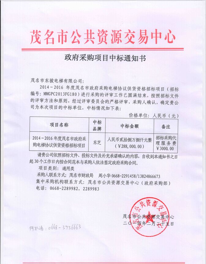 祝賀茂名市東駿電梯有限公司中標茂名市財政局電梯設備采購招標項目 |